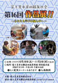 企画展「江幡三香展 ~木の本とおもちゃの世界~」 会期:令和7年10月4日(土)~11月16日(日) 企画展「狭山の戦争の記憶とくらしー戦後80年、そして未来への継承ー」 会期:令和7年12月20日(土)~令和8年2月8日(日) |