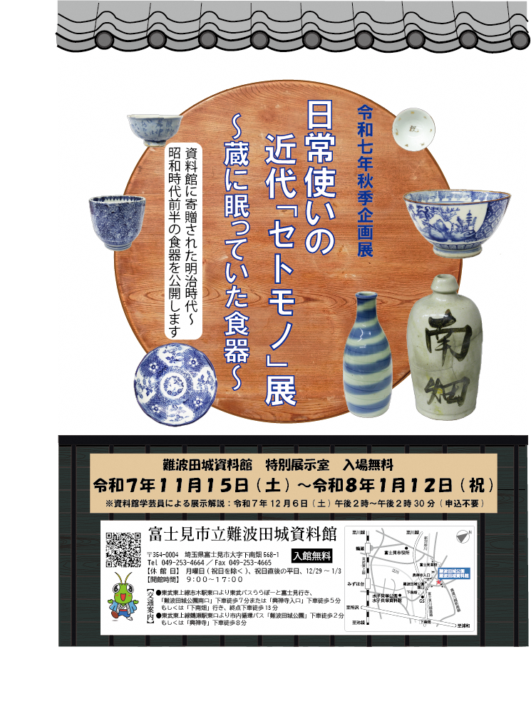 富士見市資料館友の会作品展 会期:令和7年10月18日(土)~11月3日(月・祝) 令和7年秋季企画展「日常使いの近代「セトモノ」展」 会期:令和7年11月15日(土)~令和8年1月12日(月・祝) |