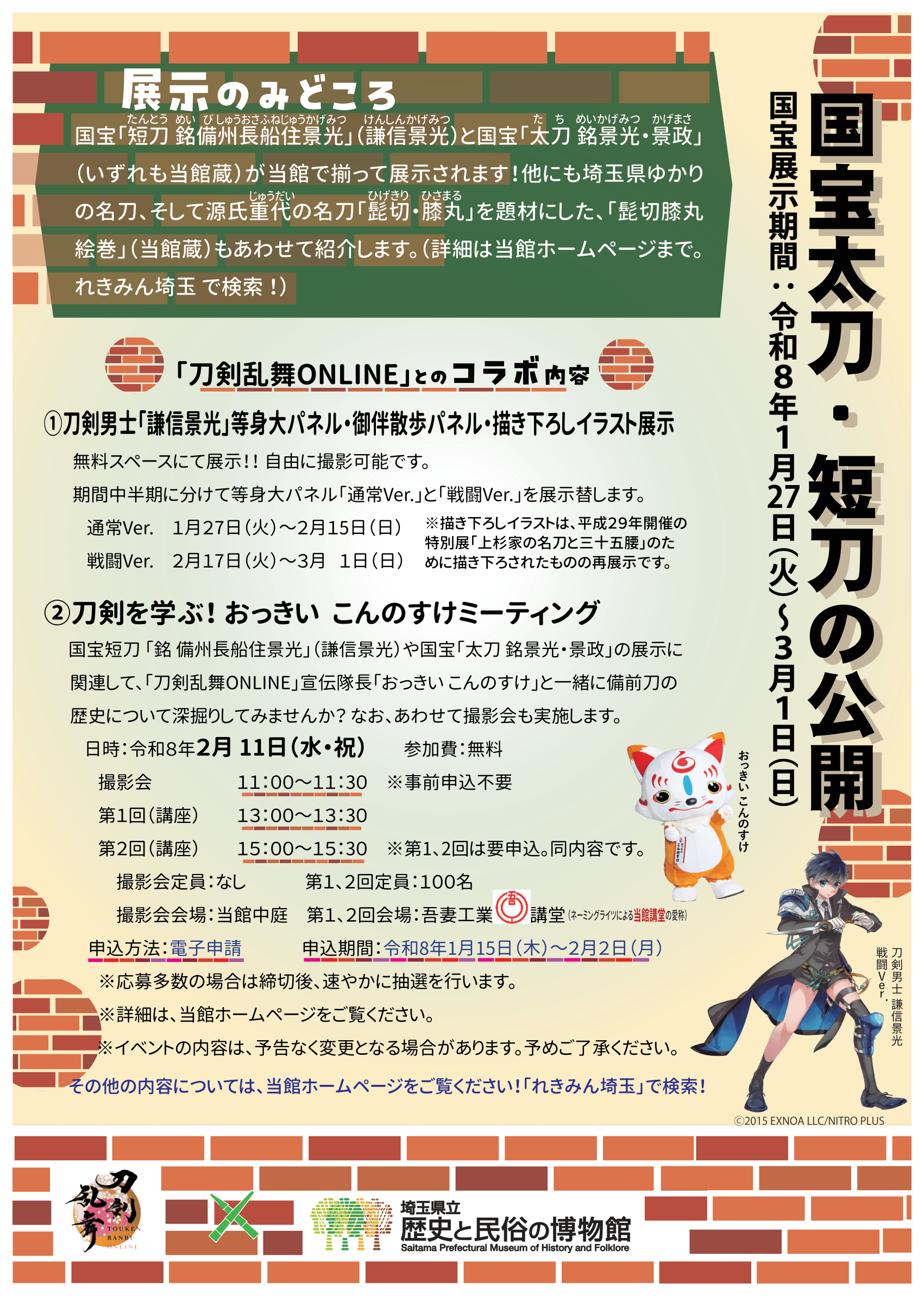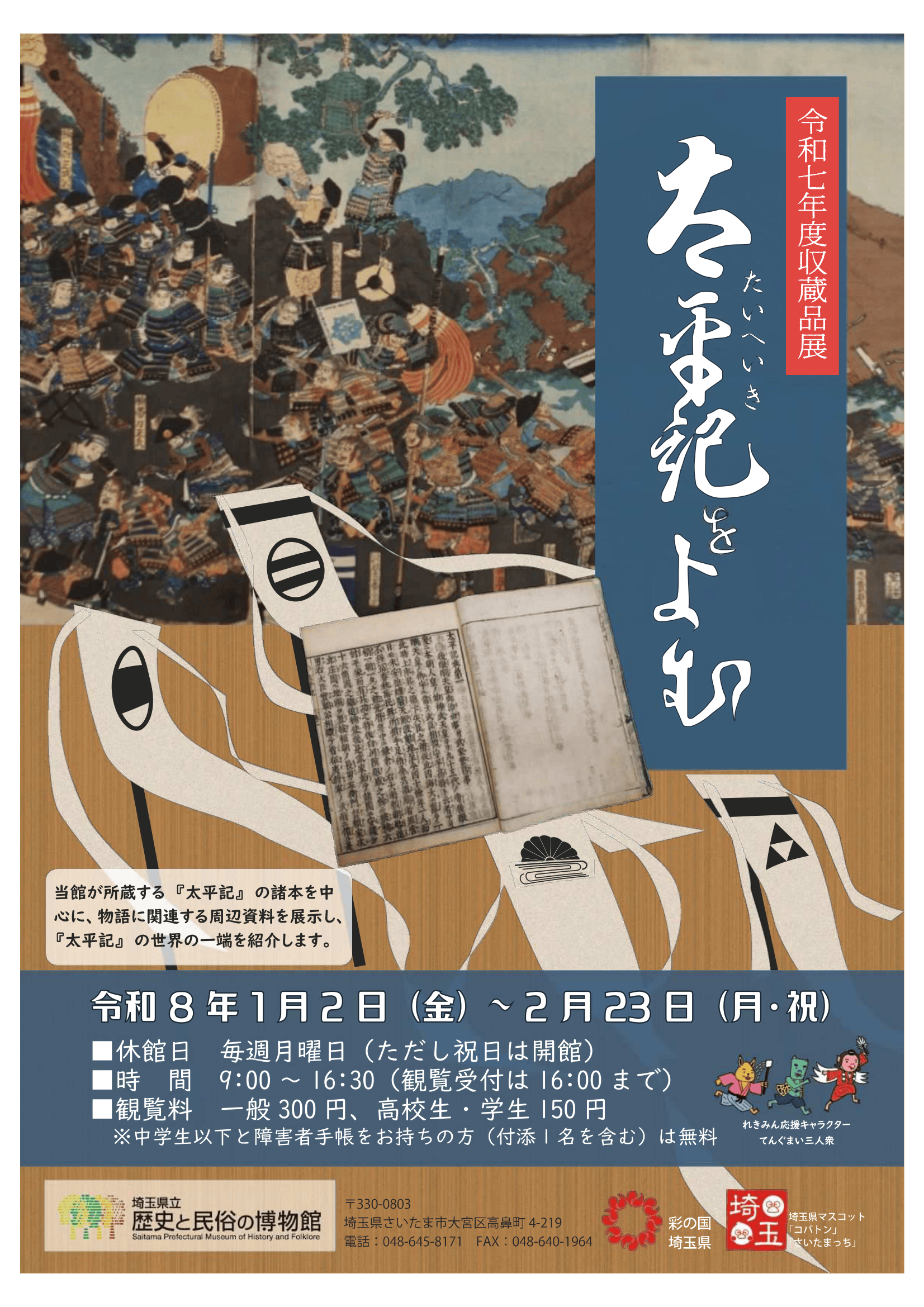 収蔵品展「太平記をよむ」 会期:令和8年1月2日(金)~2月23日(月・祝) 特集展示「国宝太刀・短刀の公開」 会期:令和8年1月27日(火)~3月1日(日) 特別展「埼玉の宝物」 会期:3月14日(土)~5月6日(水・振休) 美術特集展示「武士の美術」 会期:令和7年12月16日(火)~令和8年3月8日(日) 歴史特集展示「選挙と議会」 会期:令和7年11月18(火)~令和8年3月8日(日) 民俗コラム展示「馬と祈り」 会期:令和7年10月28日(火)~令和8年3月15日(日) 考古特集展示「縄文人と豊かな植物資源」 会期:令和7年7月15日(火)~令和8年7月12日(日) 常設展示「埼玉における人々のくらしと文化」 会期:常設 |