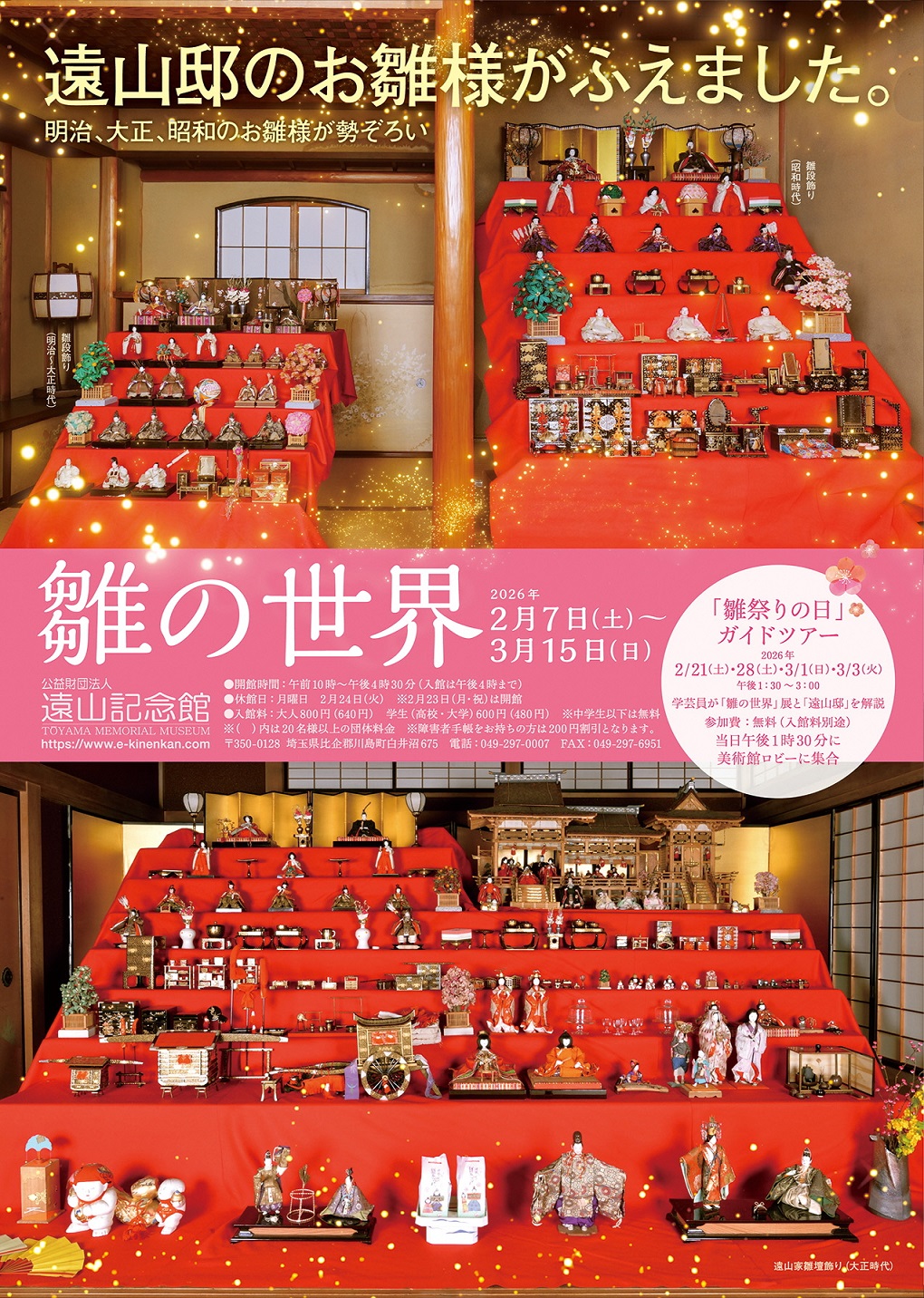 毛呂山町合併70周年記念企画展 「あなたと歩んだ毛呂山町 その記憶」 会期:令和7年10月18日(土)~令和8年3月16日(日) 指定文化財特別公開「享保雛」 会期:令和8年2月7日(土)~3月8日(日) |