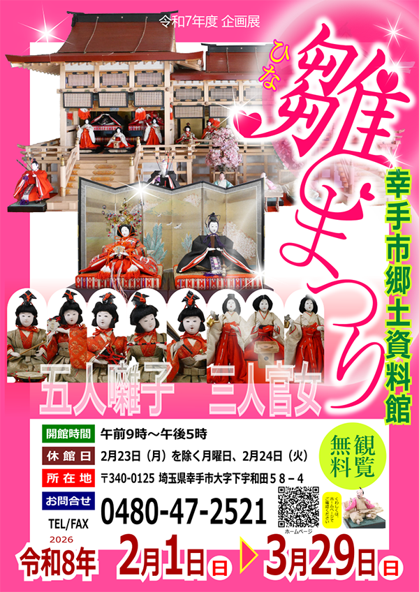 スポット展示「干支の郷土玩具」 会期:令和8年1月4日(日)~2月6日(金) 博学連携展示「行田市のうつりかわり」 会期:令和8年2月7日(土)~4月5日(日) スポット展示「ひな人形」 会期:令和8年2月7日(土)~3月31日(火) |