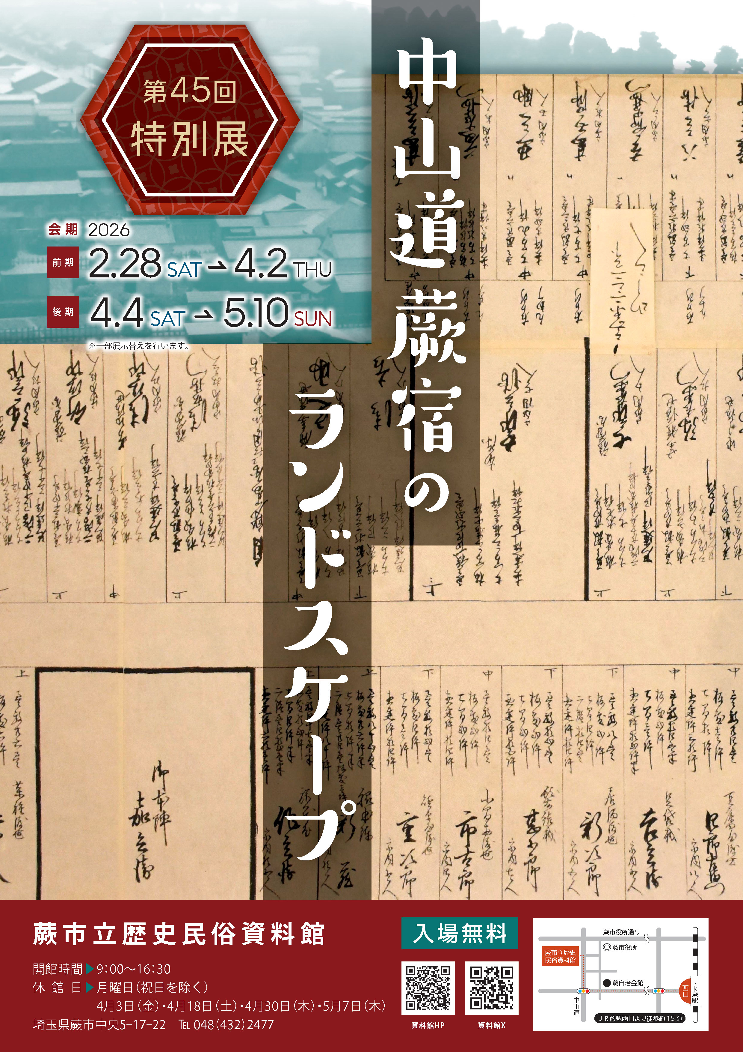第45回特別展「中山道蕨宿のランドスケープ」 会期:令和8年2月28日(土)~5月10日(日) ※前期:2月28日(土)~4月2日(木) 後期:4月4日(土)~5月10日(日) |