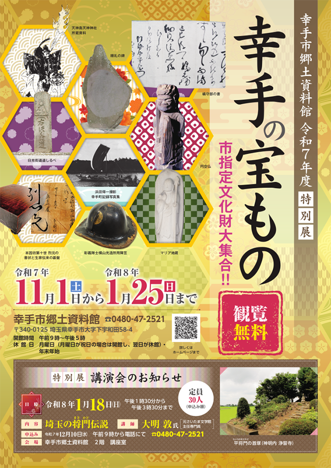 特別展「幸手の宝もの 指定文化財大集合!!」 会期:令和7年11月1日(土)~令和8年1月25日(日) |