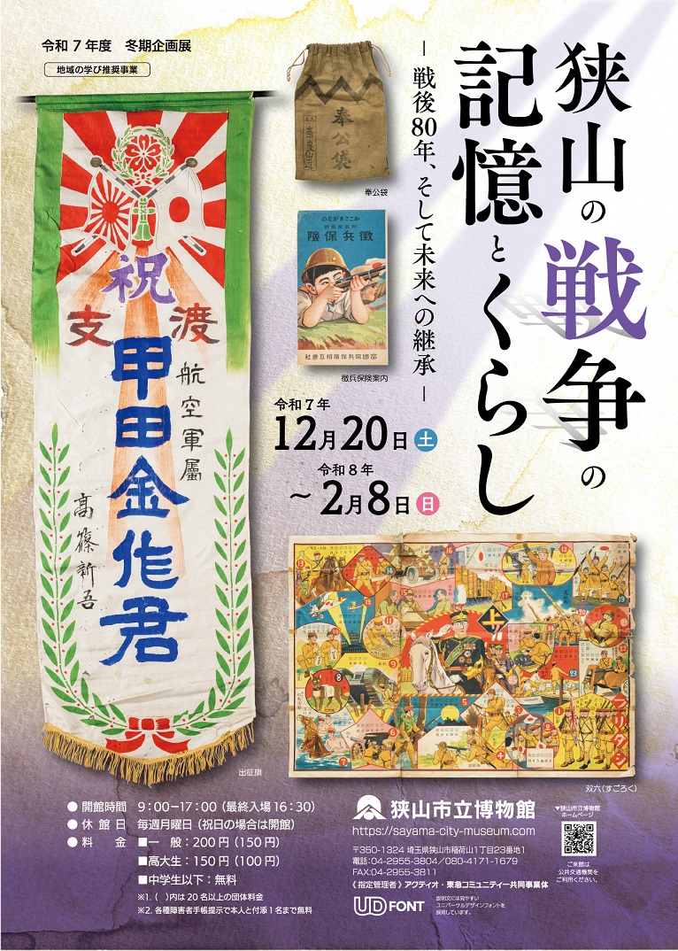 企画展「狭山の戦争の記憶とくらしー戦後80年、そして未来への継承ー」 会期:令和7年12月20日(土)~令和8年2月8日(日) 企画展「ものづくりの街 さやま ーお菓子今昔物語ー」 会期:令和8年3月20日(金)~5月17日(日) |