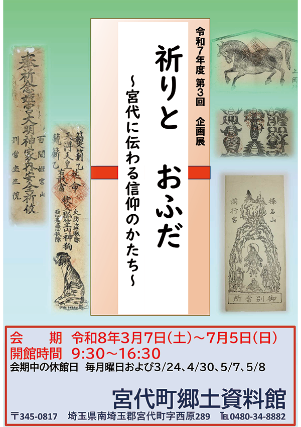 東部地区文化財担当者会40周年記念リレー展示 企画展 「都鳥が見た古代~埼玉県東部地区の奈良時代・平安時代~」 会期:令和8年1月6日(火)~3月1日(日) 第3回企画展「祈りと おふだ~宮代に伝わる信仰のかたち~」 会期:令和8年3月7日(土)~7月5日(日) |